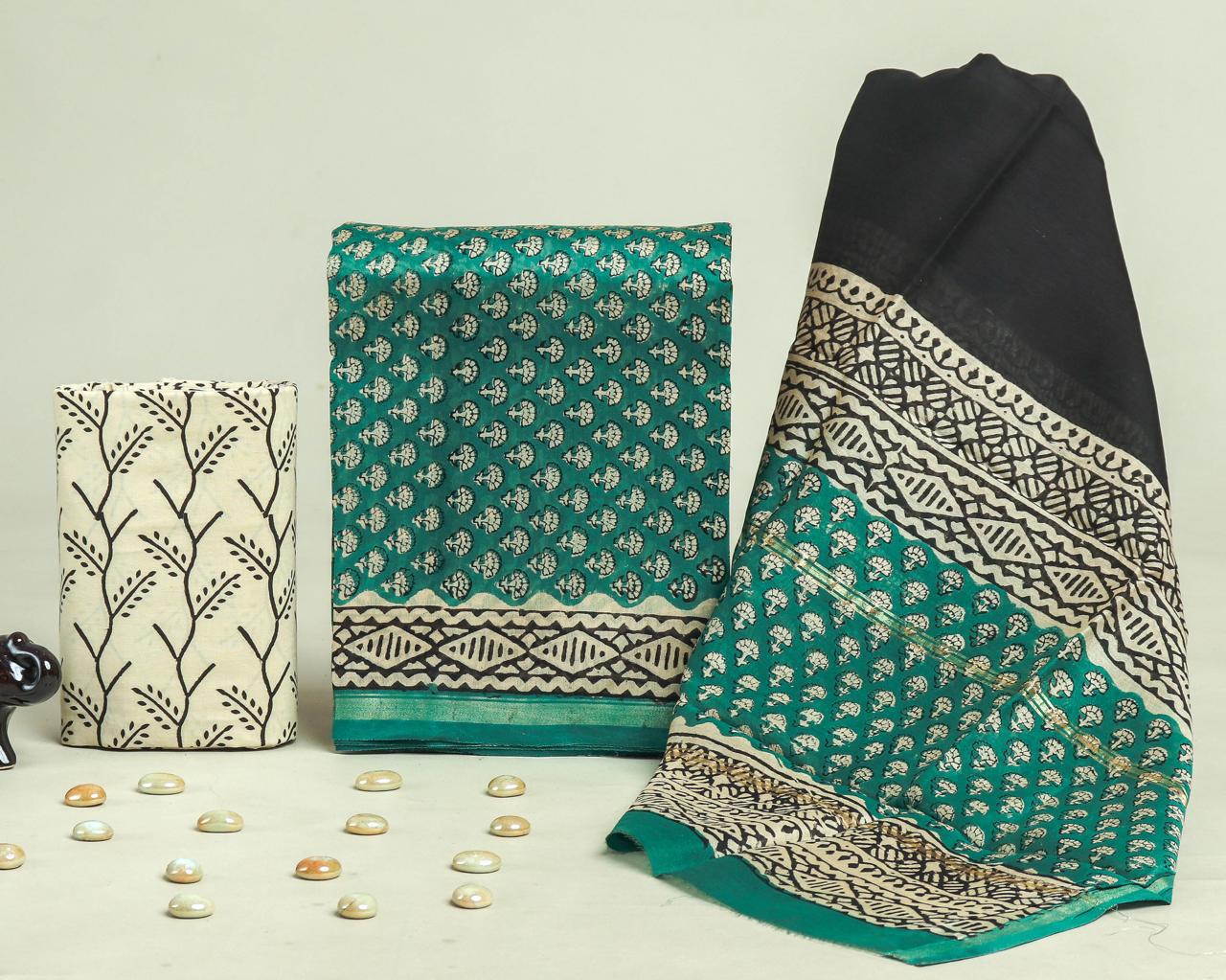 Unstitched Hand Block Print Kurti Pant Set Fabric – Top & Dupatta 2.5m : Chanderi Silk, Bottom 2.5m : Cotton