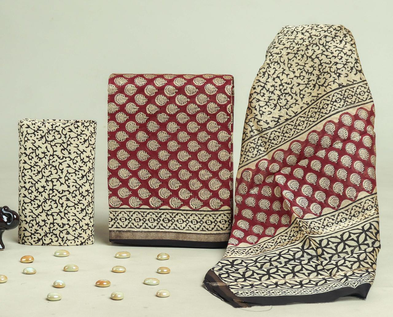 Unstitched Hand Block Print Kurti Pant Set Fabric – Top & Dupatta 2.5m : Chanderi Silk, Bottom 2.5m : Cotton