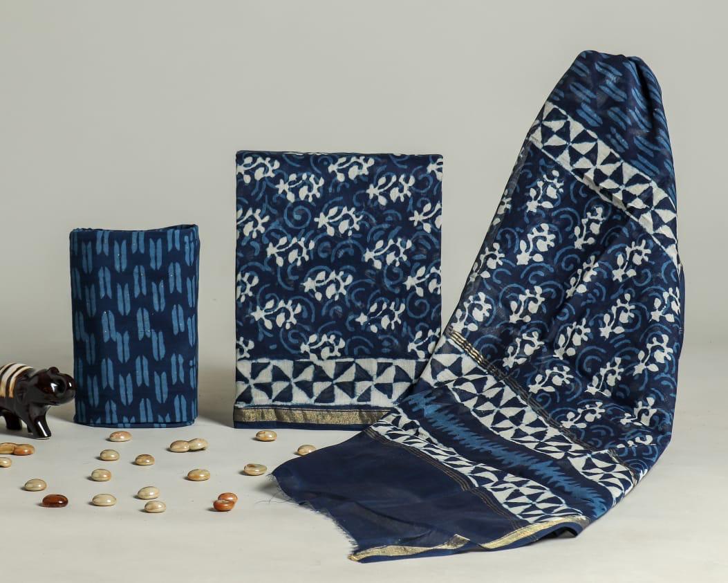Unstitched Hand Block Print Kurti Pant Set Fabric – Top & Dupatta 2.5m : Chanderi Silk, Bottom 2.5m : Cotton