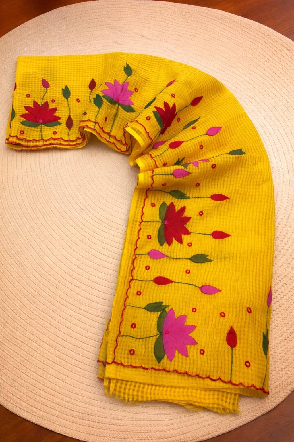 Kota Silk Handloom Saree – Yellow without Blouse – Silk thread Lotus & Floral Motifs Embroidered all over the body
