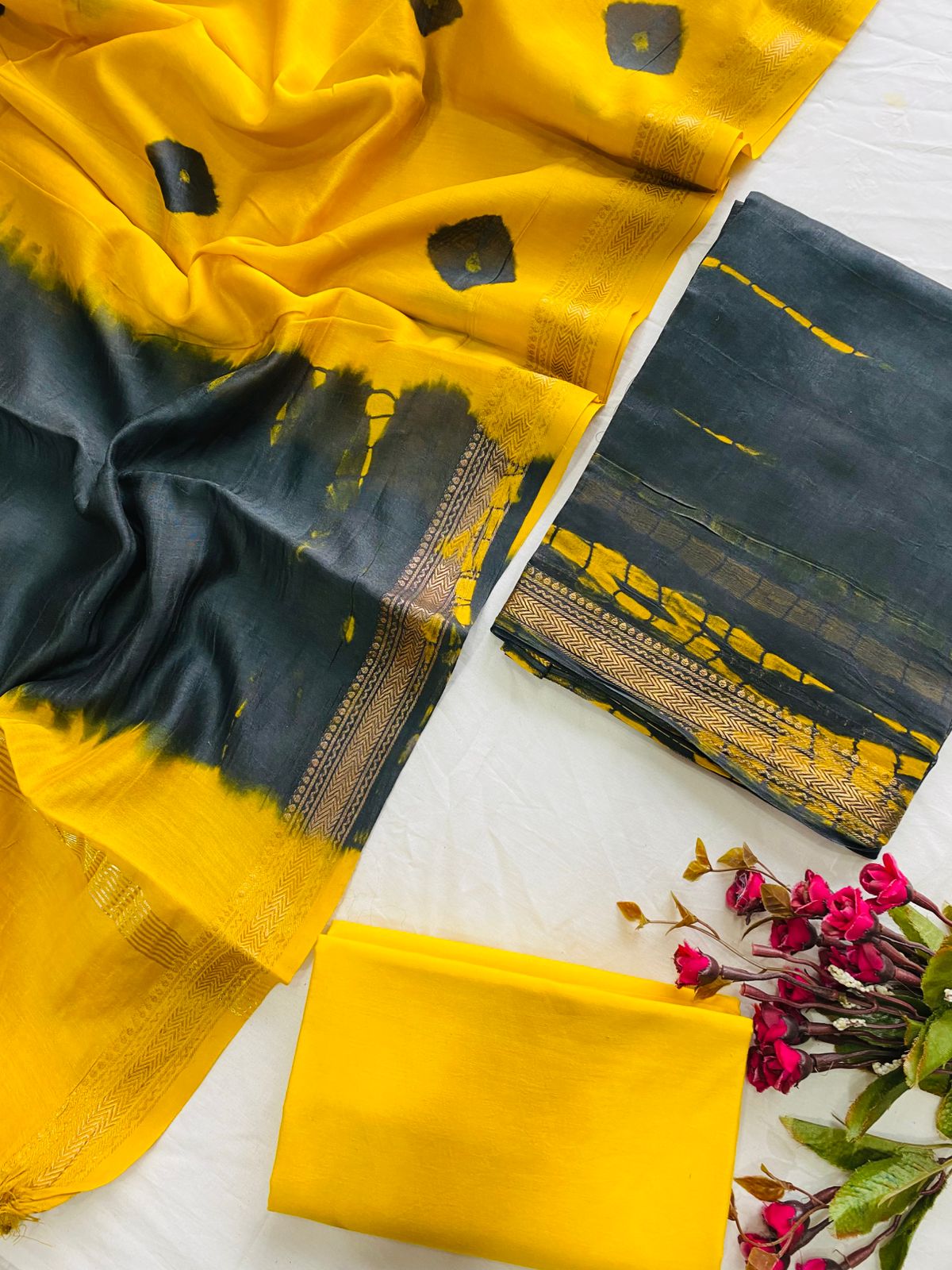 Unstitched Hand Block Print Ajrakh Print Bagru Print Dabu Print Kurti Pant Set Fabric with zari border – Top & Dupatta – 2.5m : Maheswari Silk, Bottom 2.5m : Cotton