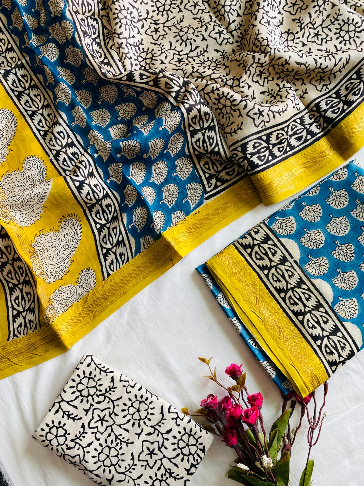 Unstitched Hand Block Print Ajrakh Print Bagru Print Dabu Print Kurti Pant Set Fabric with zari border – Top & Dupatta – 2.5m : Maheswari Silk, Bottom 2.5m : Cotton