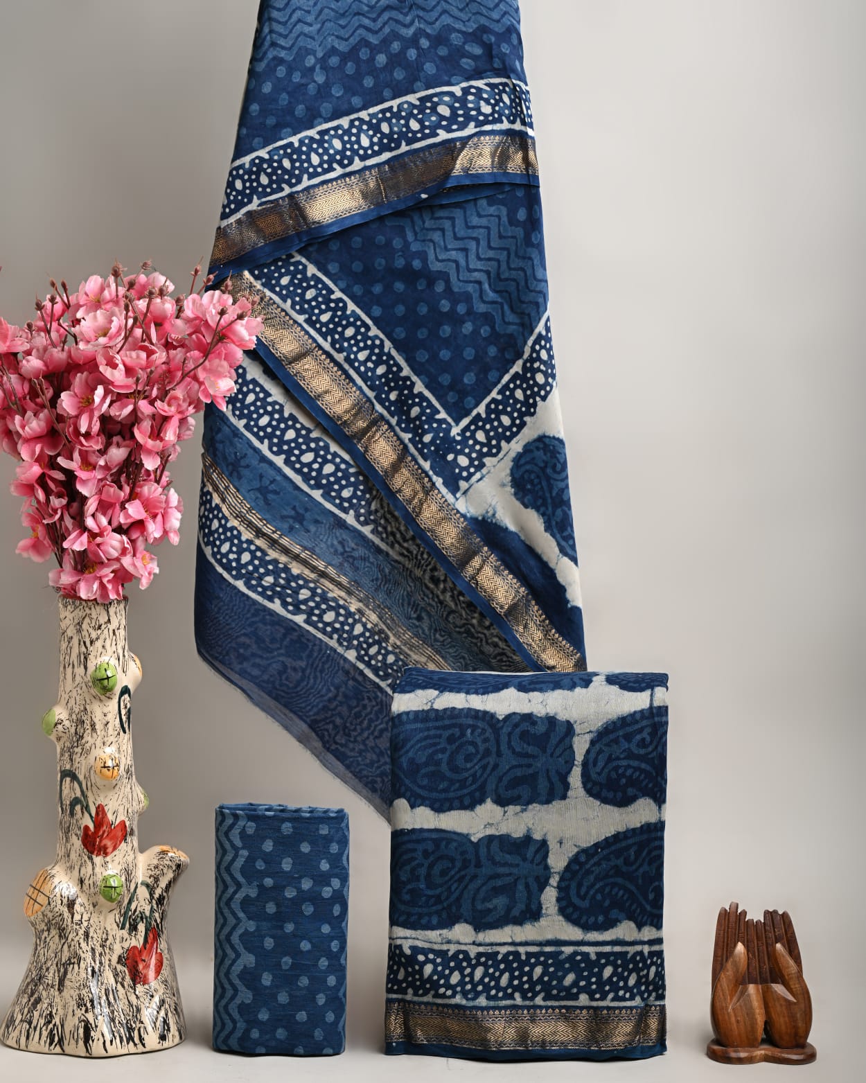 Unstitched Hand Block Print Ajrakh Print Bagru Print Dabu Print Kurti Pant Set Fabric with zari border – Top & Dupatta – 2.5m : Maheswari Silk, Bottom 2.5m : Cotton
