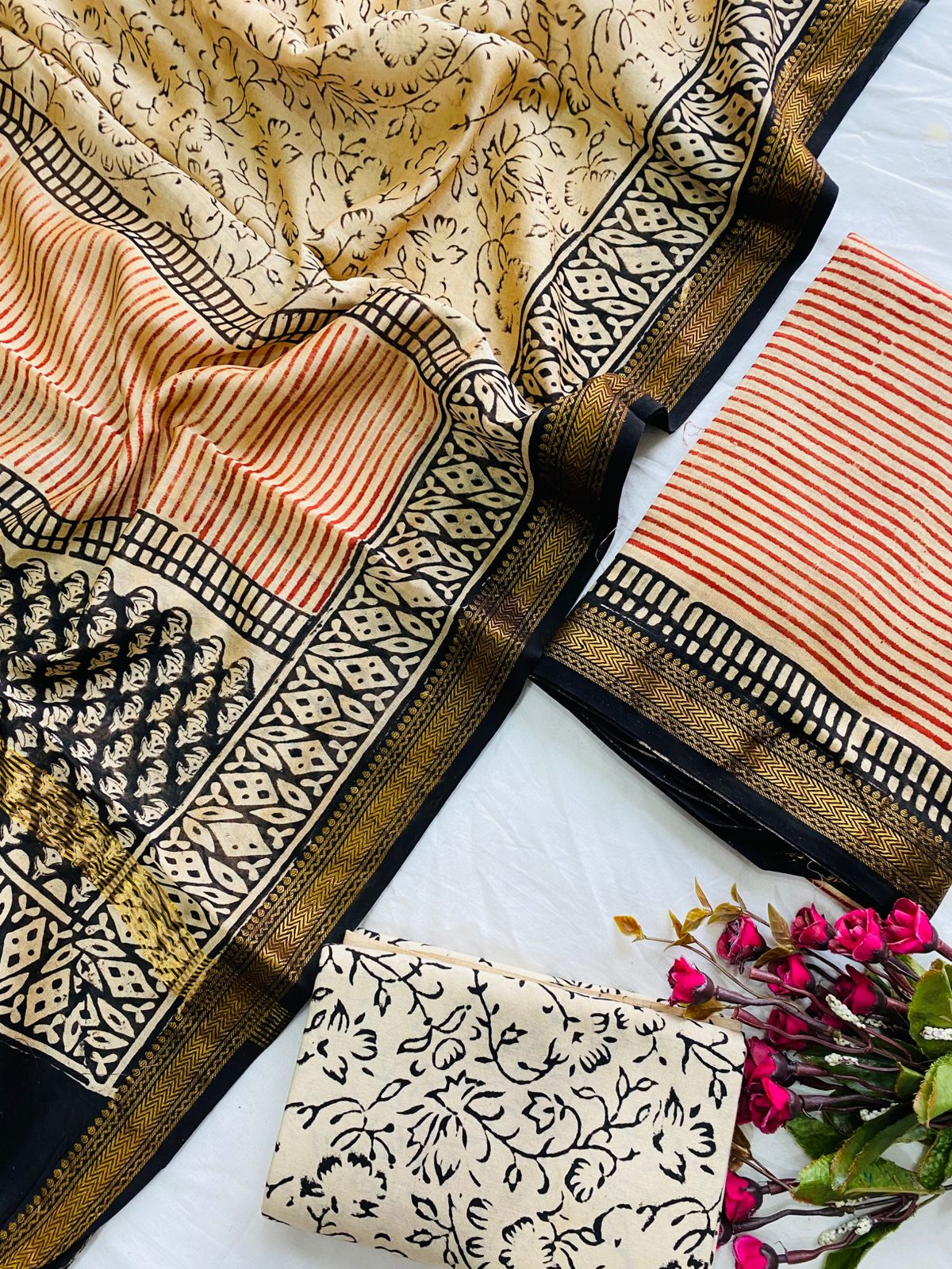 Unstitched Hand Block Print Ajrakh Print Bagru Print Dabu Print Kurti Pant Set Fabric with zari border – Top & Dupatta – 2.5m : Maheswari Silk, Bottom 2.5m : Cotton