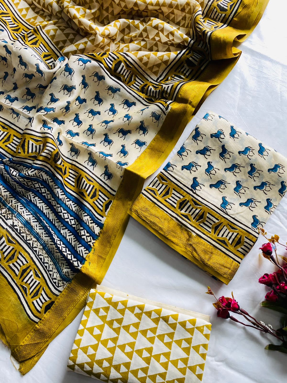 Unstitched Hand Block Print Ajrakh Print Bagru Print Dabu Print Kurti Pant Set Fabric with zari border – Top & Dupatta – 2.5m : Maheswari Silk, Bottom 2.5m : Cotton