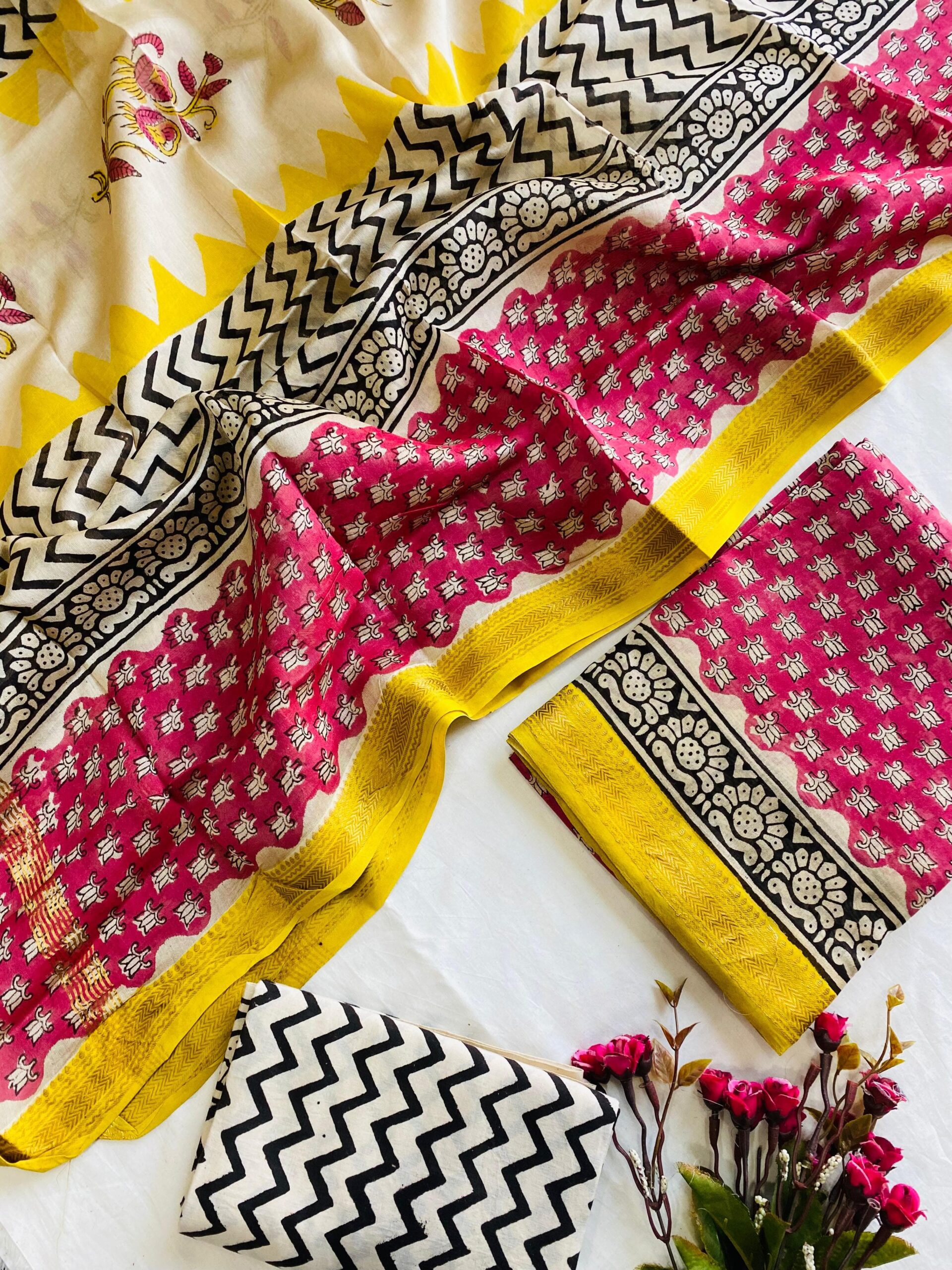 Unstitched Hand Block Print Ajrakh Print Bagru Print Dabu Print Kurti Pant Set Fabric with zari border – Top & Dupatta – 2.5m : Maheswari Silk, Bottom 2.5m : Cotton