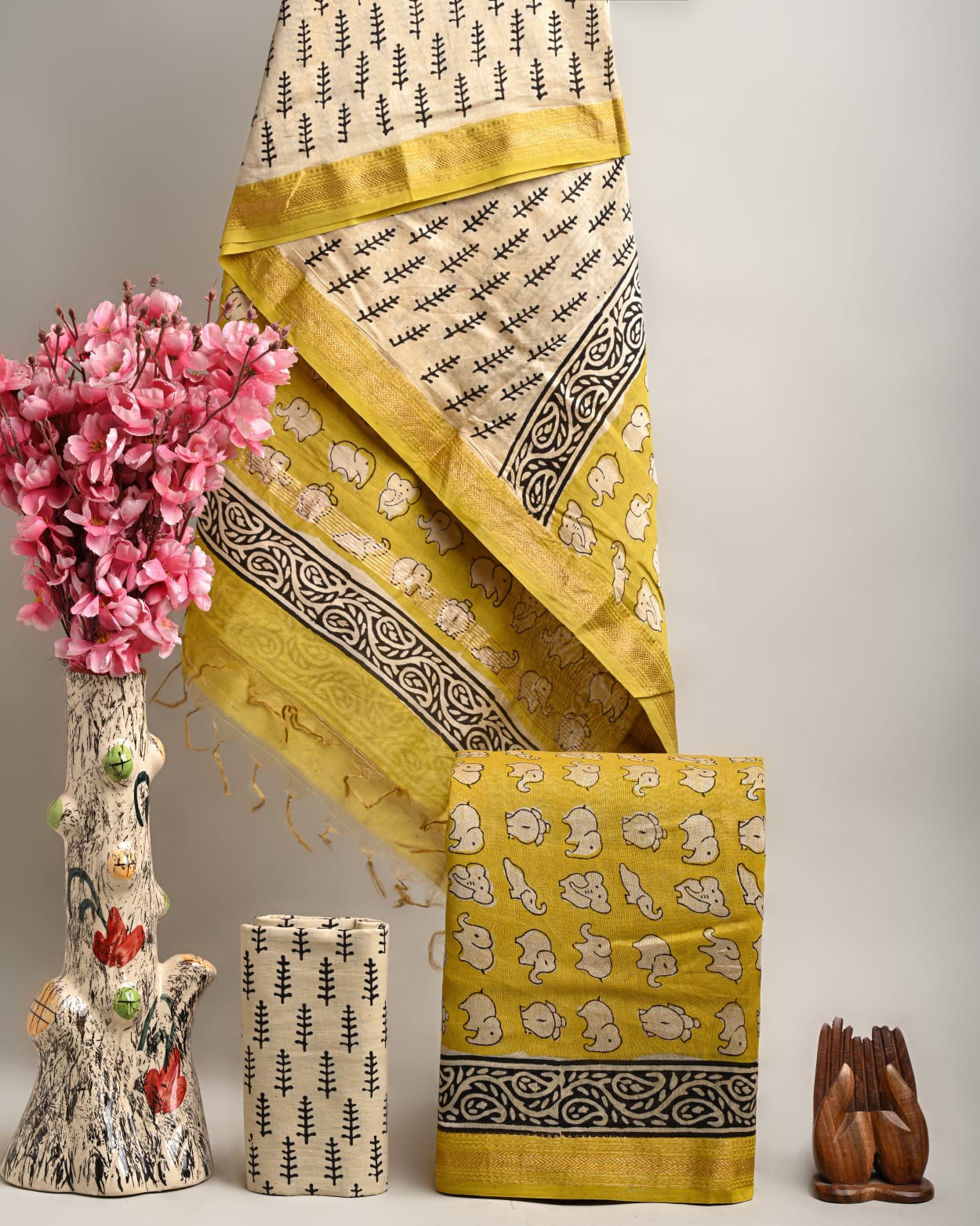 Unstitched Hand Block Print Ajrakh Print Bagru Print Dabu Print Kurti Pant Set Fabric with zari border – Top & Dupatta – 2.5m : Maheswari Silk, Bottom 2.5m : Cotton