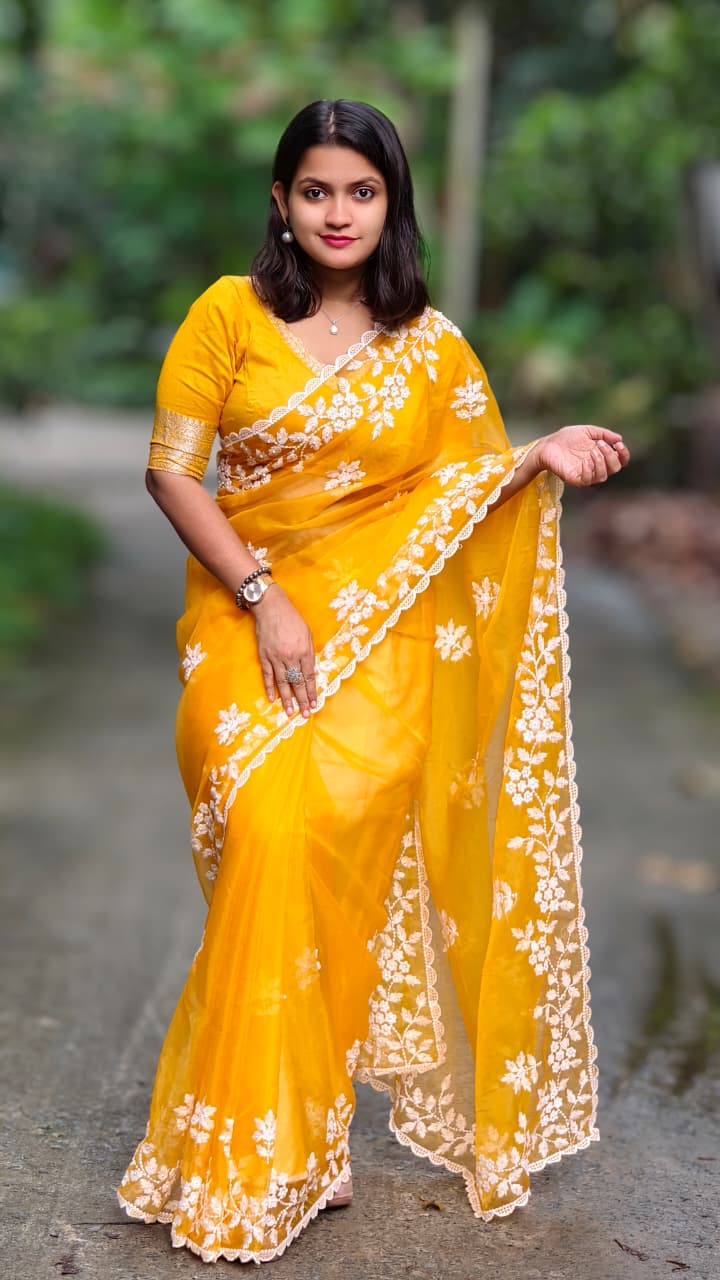 Murshidabad Chiffon Silk Saree – Yellow with Haqubha Work Blouse